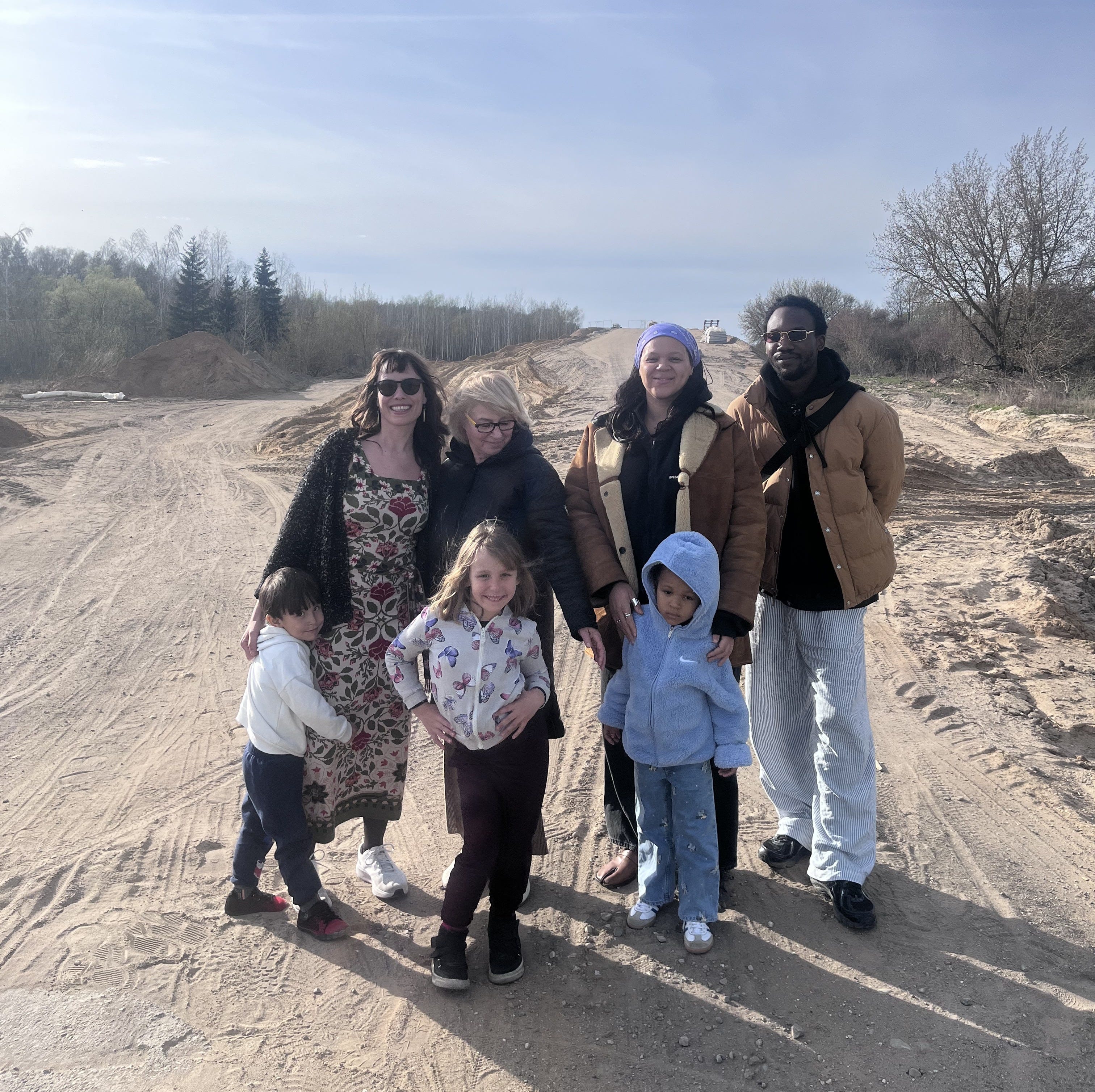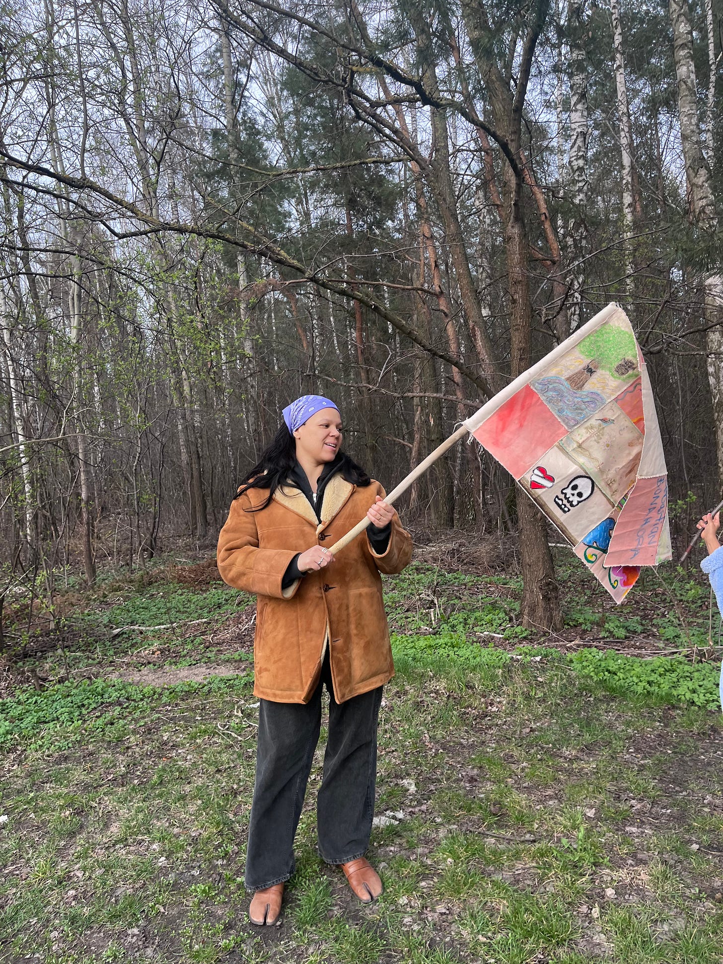 I brought the flag with me when we went for a walk together to see the building of a new road that cuts through the forest that marked Marcin’s childhood. When we first arrived in Łapy this time, we tried to walk along the paths he used to take as a child, only to be interrupted by the big machines and the large piles of sand and mud of construction. I was reminded that the assault of “progress” on nature isn’t happening only in Brazil and countries of the Global South, but is a continuous process in capitalist societies. This experience corroborated the understanding carried by the flag of our displacement from land and the interruption of the continuity between memory and present life, making our lives a stitching of brevity and limited shared realities. After the initial shock of seeing the forest destroyed, we took advantage of the construction pause during the holidays and ignored the prohibitive signs to explore the area. Marcin found a wooden pole for the flag among the construction zone’s garbage piles, and we crossed to the other side of the forest. I asked my niece, Justyna Obassi, to hold the flag for a photo, as I feel she embodies many of the ideas the flag carries: she is an internationally renowned film director who travels the world shooting commercials and short films, creating visually appealing narratives (often about love) with small groups of people.