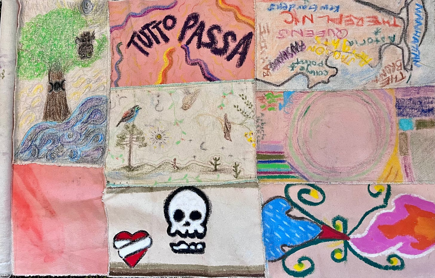 After the class, I took the individual paintings back to my home studio and began assembling the flag. In deciding the position of each painting within the flag format, I meditated on the meaning of each image as shared by the students. On top, I placed an image of a tree representing nature, with an owl on it, which symbolizes knowledge. Next to it, the phrase “Tutto Passa” conveys a message particularly suited to a flag for temporary collectivities and brief encounters. On the right of “Tutto Passa,” we see a map of New York City, centered on Queens as “the real” NYC, an image that at the same time locates the flag’s creation and displaces it with the question of a real territory for a representative culture. I placed the map upside down in reference to Joaquín Torres García. Under the map image, we see a representation of “empty space,” a concept that challenges existence itself, evoking the necessity of making containers for ideas and the always-present potentiality for life. To the left of the image of “empty space,” we again have nature, this time as a dreamy landscape that can be viewed from any direction, with plants, animals, and human life coexisting peacefully. Under this image of nature, we see two emoticons: one representing pain and a healing heart, and the other representing death. To the left of this image, we see water and fire meeting at the center to create life, representing the force and movement of life through elemental materials. To complete the flag, I stitched one canvas with only casein paint, like the ones I gave to students, as a way to include a “blank canvas” or an abstract image that shows painting as the basis for this flag’s creation—the anthropophagic stomach, where all ideas get digested.