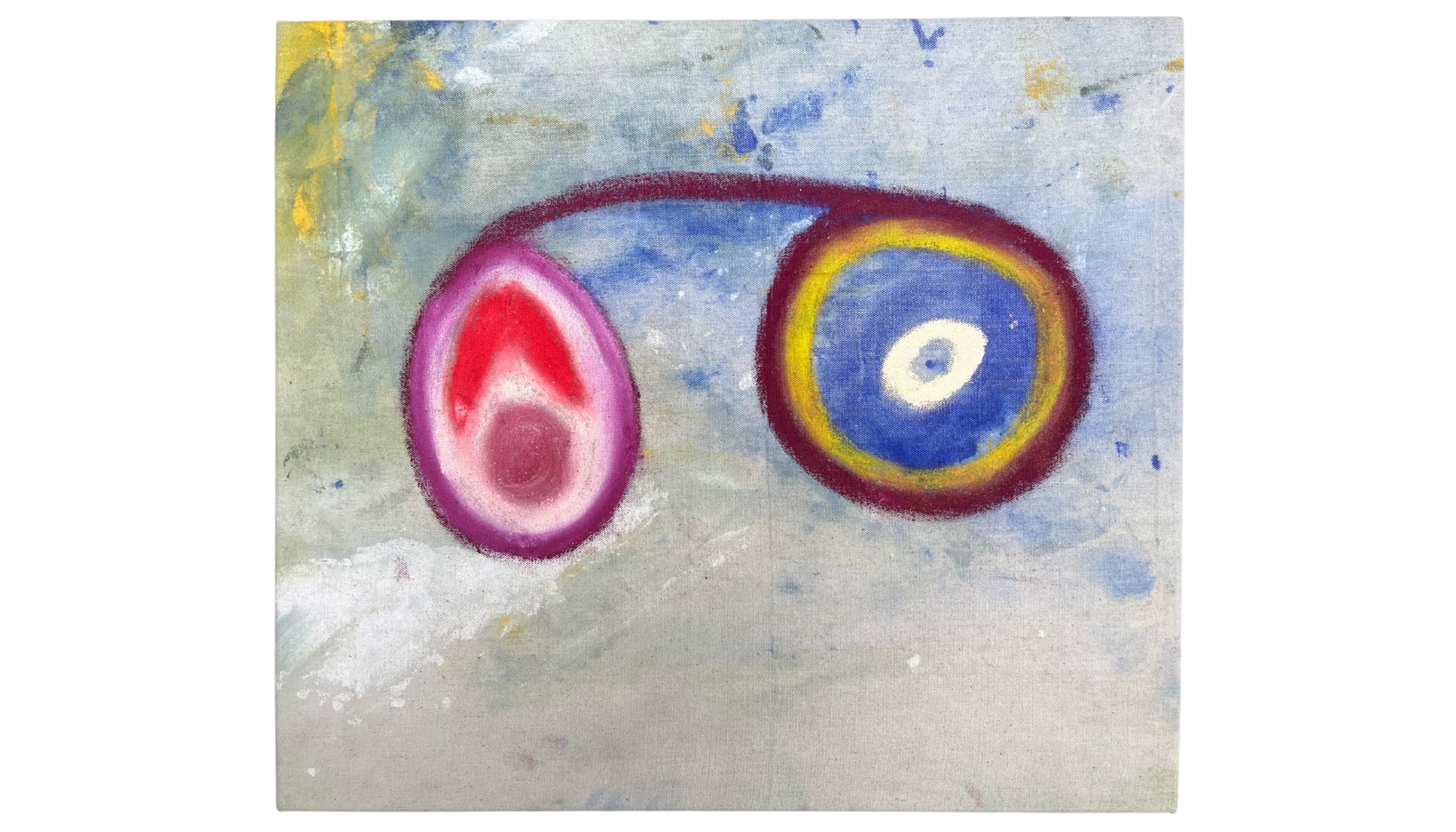 Spiritual Anatomies is part of a series of works titled Cosmic Flowers, which carries a making process that begins with a group of people painting together and finishes with my practice alone in the studio. The first phase of making happened at Open Studio Practices I carried out at the Soil Factory (Ithaca, NY) to create space for communal art-making. From the large canvases painted with others, I extracted smaller pieces on which I identified specific gestures that could become forms. This series aims to unveil forms that situate a painting as an individual meditative space, still cultivating the presence of a collectivity. In Spiritual Anatomies, the form that emerges shows two polarities connected through an external line. They suggest physical or spiritual dualities that, when bridged, can complement each other, such as the body and the soul, the brain and the heart, the eye and the stomach.